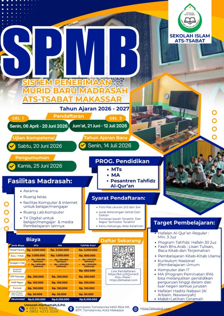 MAKASSAR – Sekolah Islam ATS-TSABAT Makassar resmi membuka Sistem Penerimaan Murid Baru (SPMB) untuk Tahun Ajaran 2026/2027. Sekolah yang berlokasi di Kompleks Tamalanrea MAS ini menawarkan program pendidikan berbasis agama dan umum yang komprehensif, mulai dari tingkat Madrasah Tsanawiyah (MTs), Madrasah Aliyah (MA), hingga Pesantren Tahfidz Al-Qur’an.